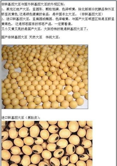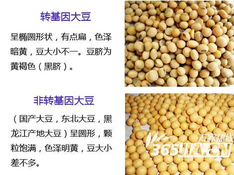 转基因大豆:为圆形,滚圆。肚脐为黄色或黄褐色。豆大小差不多。打出来的豆浆有点黄,用此豆制作的豆腐什么的都有点黄色。
