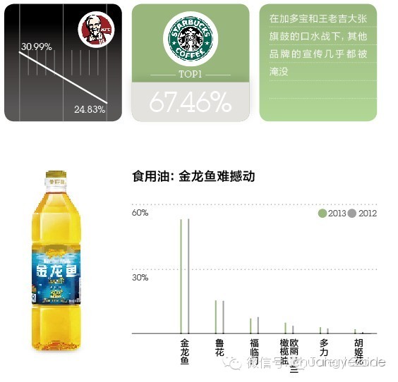 金龙鱼仍然占据超过一半的江山,鲁花和福临门虽然一直希望打破外资的主导地位,但效果甚微。倒是排名第四的欧丽薇兰橄榄油虽然定价高,但是连续三年比重提升,同样定位高端的胡姬花也前进了一步到第六名。看来在高端市场找突破口,比直接与强势的金龙鱼对抗更容易见效果,尤其是橄榄油,正被越来越讲究健康的消费者摆上餐桌,虽然越来越多的橄榄油品牌出现在市场上,但能够形成一定规模的却不多,或许这也意味着更多的机会。