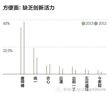 康师傅、统一合计占了方便面6成市场,康师傅仍然是第一,但是比重下降了5%,第二名的统一虽然比重有所提升,但为此付出的代价也不小。由于酸菜口味方便面同质化严重,至今未能出现新品能够再现当年统一老坛的风采,统一不得不加大市场行销投入,以致利润受到压缩,而产品线更为完备的康师傅则较好地匹配了从城市到农村的渠道网络,上半年净利润还同比上涨了2.52%,不过整个行业缺少如康师傅红烧牛肉面、统一老坛酸菜这样的创新产品,还是缺乏活力。